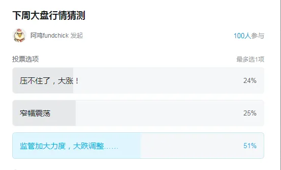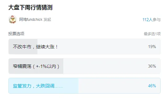 本周投票中,随着GJD持续的大力抛售,市场情绪继续走向谨慎。毕竟监管不想让大盘起飞,那么投资者自然就如同有把闸刀再头顶一样无法积极看多,总担心这把刀会随时砍下来。因此,成交量也随之下滑到2.8万亿左右,虽然对比此前的4万亿还是缩了不少,但这个绝对数额还是很大的。即,较此前明显降温了,但其实也没那么冷。