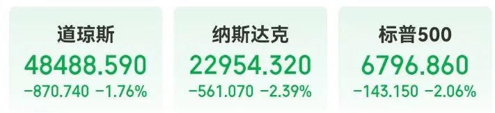 达沃斯的战火化作一支穿云箭,从瑞士小城光速射向华尔街。1月20日,美国“股债汇”三杀。三大股指均跌破均线支撑位,道指跌超870点。科技股普跌,甲骨文、博通跌超5%,英伟达、特斯拉跌超4%,亚马逊、苹果跌超3%。