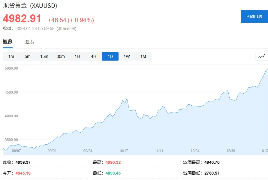 资金疯狂涌入避险资产黄金、白银均在本周创下历史新高。截至本周日,黄金即将上冲5000美元,白银跃过100美元大关。铜、铝、镍、锡的价格也在不断刷新,人工智能数据中心、电动汽车、机器人产业,共同构成市场对工业金属的强劲需求,它们正逐渐演变为“结构性投资资产”。