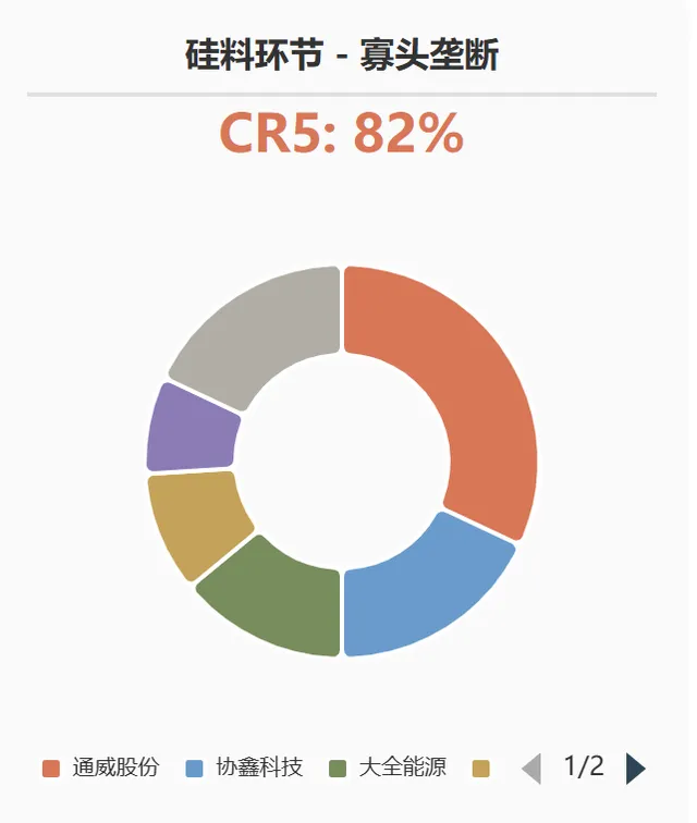 格局:经历过2020-2022年的紧缺周期后,技术资金壁垒极高,已形成通威股份、协鑫科技、大全能源、新特能源等少数巨头主导的格局。CR5(前五大企业集中度)超过 80%。
