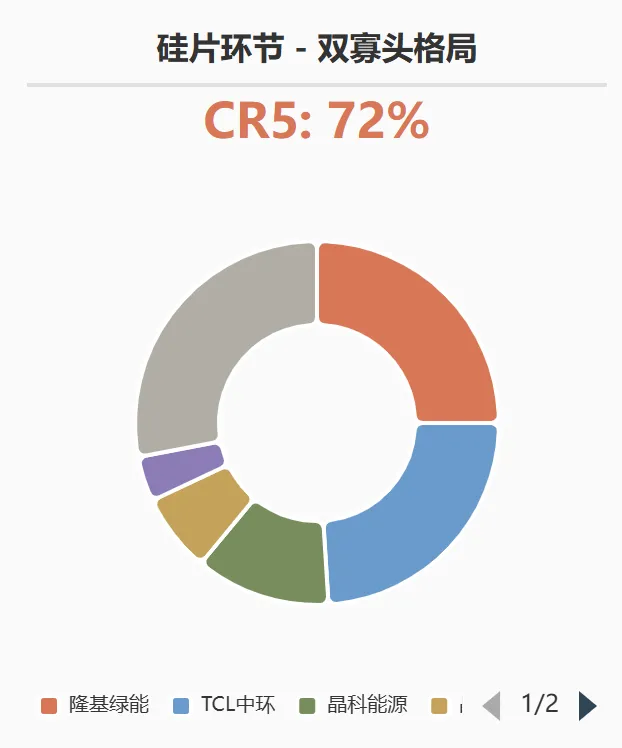 格局:TCL中环 和 隆基绿能 形成的“双寡头”格局稳固,两者合计占据全球超过 50% 的市场份额。