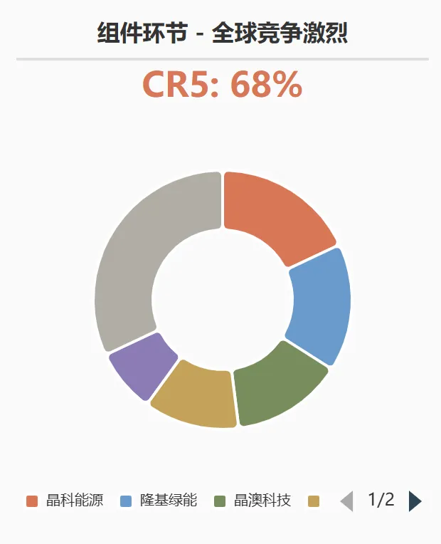 格局:一体化布局成为主流。隆基绿能、天合光能、晶科能源、晶澳科技 构成全球组件出货量的第一梯队,CR5超过 60%。