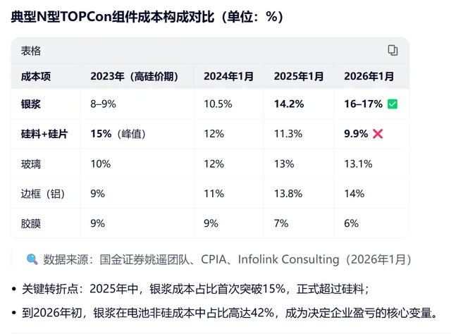 白银已正式超越硅料/硅片,成为光伏组件成本结构中的第一大单项成本。