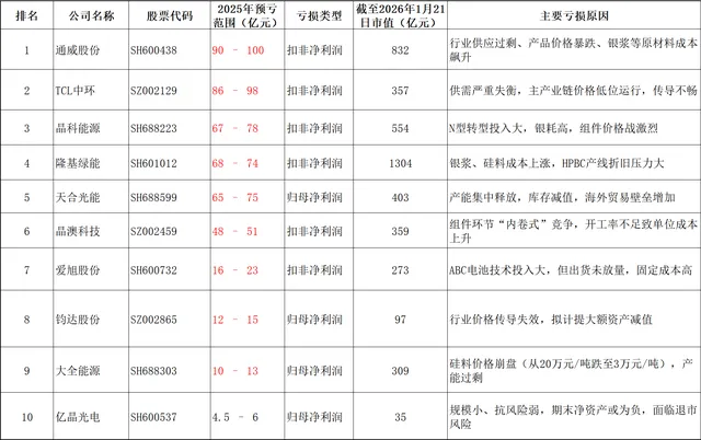 2025年光伏全行业亏损总额预计突破1000亿元。仅头部10家企业,2025年合计预亏超420亿元;