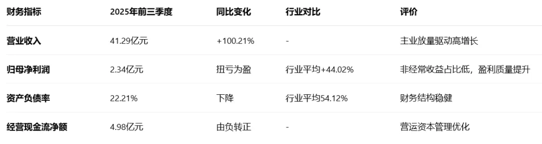 盈利能力改善:2025年前三季度营收41.29亿元,归母净利润2.34亿元(扣非净利润占比94.2%),经营性现金流净额4.98亿元(由负转正)。