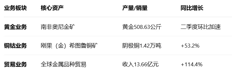 黄金业务:以南非奥尼金矿为核心,采用“地-采-选-冶”一体化运营。矿石在西选厂加工后委托兰德精炼厂制成标准金,定价挂钩伦敦金价。2025年上半年黄金产量508.63公斤,其中二季度产量325.72公斤,产能爬坡显著。