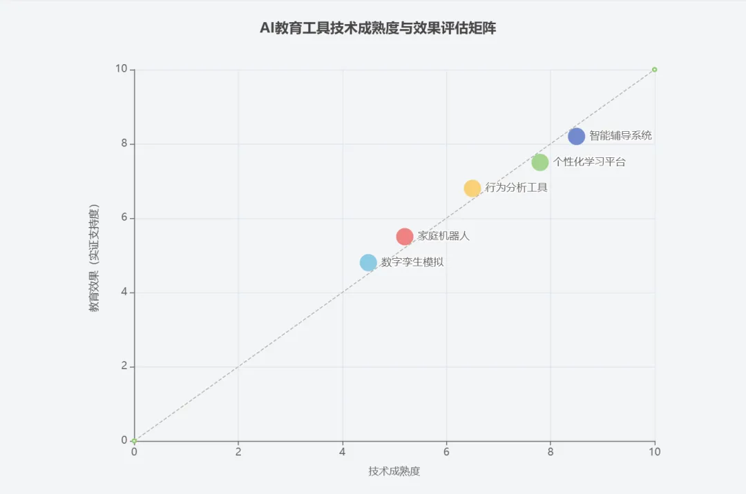 技术定位:智能辅导系统已具备规模化应用条件(效应值0.76),但必须作为“互补工具”而非“替代品”。行为分析工具潜力巨大,但需解决技术成熟度问题。家庭机器人和数字孪生模拟尚处探索阶段。