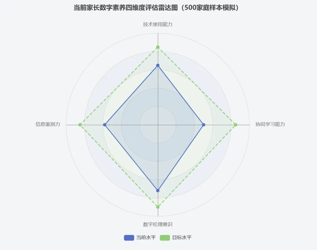 能力缺口:当前家长数字素养在四个维度呈现不均衡发展:技术使用能力(65分)、信息鉴别力(58分)、数字伦理意识(72分)、协同学习能力(50分)。协同学习能力是最薄弱环节。