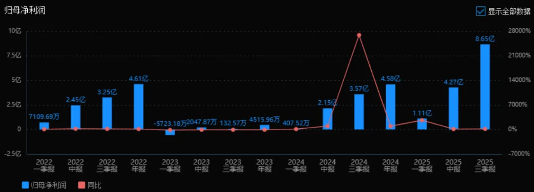2) 归母净利润:2025年三季度的归母净利润为8.65亿元,相较于2024年三季度的3.57亿元,增长了142.14%。评价: 净利润增速远超收入增速,说明公司盈利能力大幅提升,成本控制或产品结构优化效果显著。