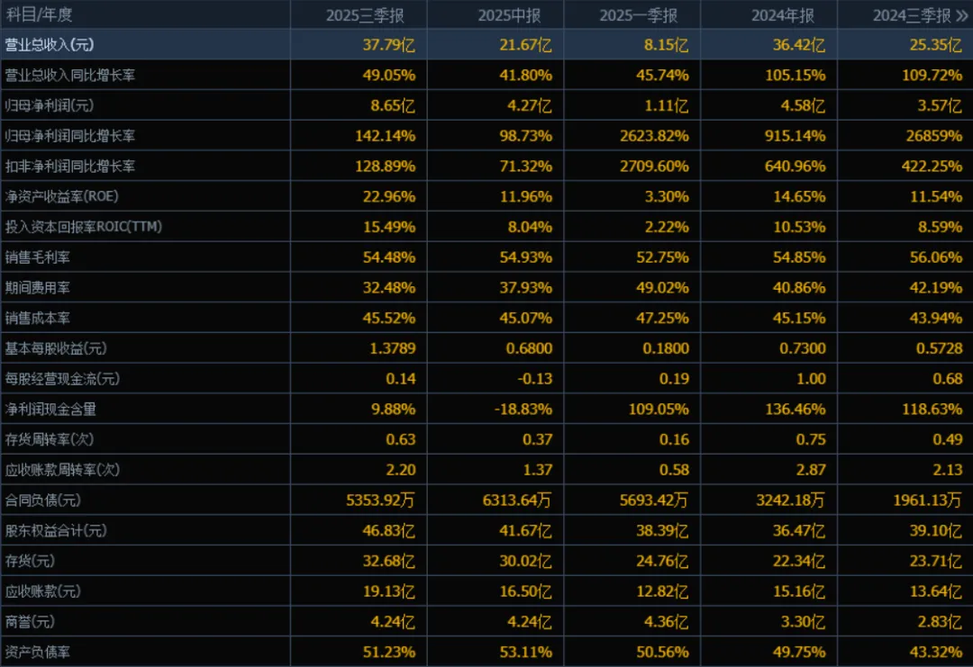 1) 营业总收入:2025年三季度的营业总收入为37.79亿元,相较于2024年三季度的25.35亿元,增长了49.05%。评价: 收入增长显著,说明公司业务持续扩张,市场竞争力较强。