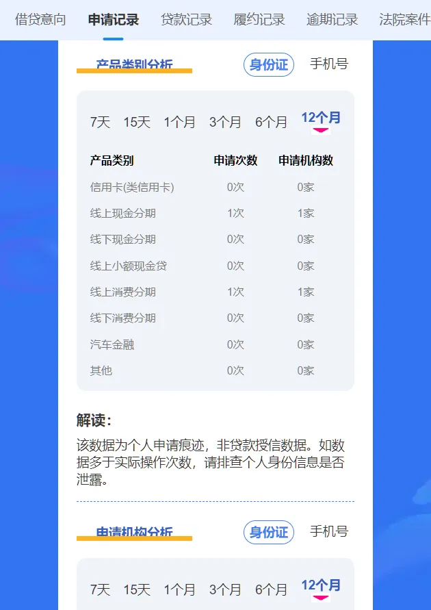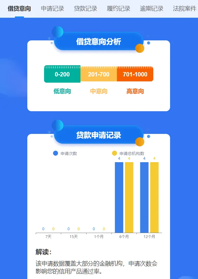 信用申请记录、借贷意向、借贷记录、履约、逾期、风险排查、司法等 等,比较全面。
