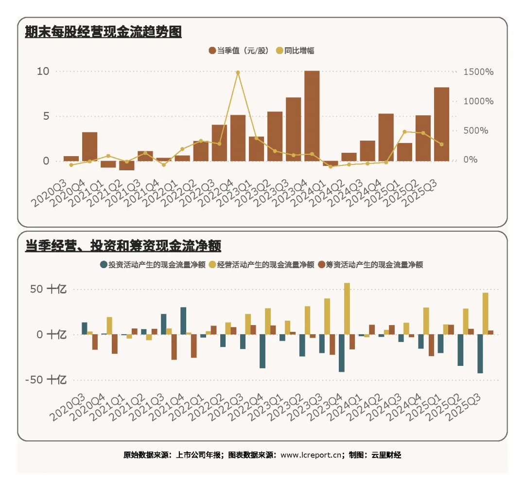 2025Q3季度末,格力电器每股经营现金流达8.16元/股,同比增幅高达261.64%,表面看现金流表现亮眼。但深入分析可见,核心现金流入仍依赖销售商品收到的现金,而该数据的高增长更多源于渠道压货与应收账款回收政策调整,而非终端需求的真实回暖。