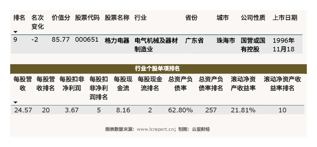 截至2025Q3季度末,格力电器市净率仅1.54倍,处于历史低位,估值低迷的背后是市场对其增长前景的担忧。从行业排名看,公司综合价值分[注2]较上一季度下降2个名次,核心财务指标如营收增速、净利润增速、海外收入占比等均落后于美的、海尔。