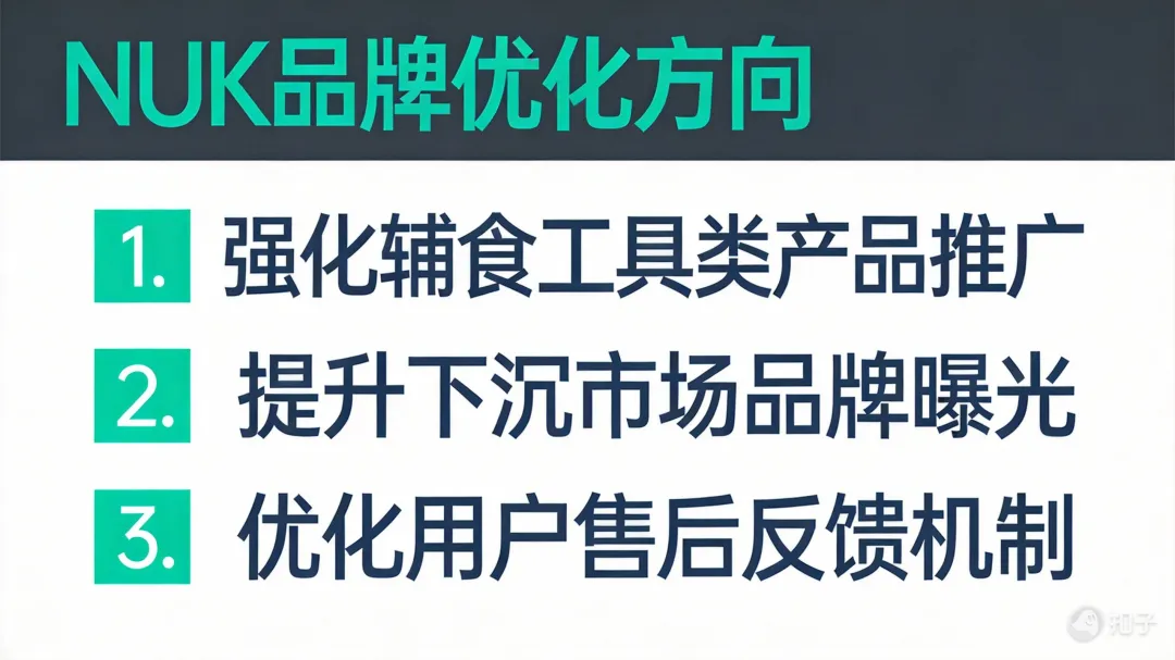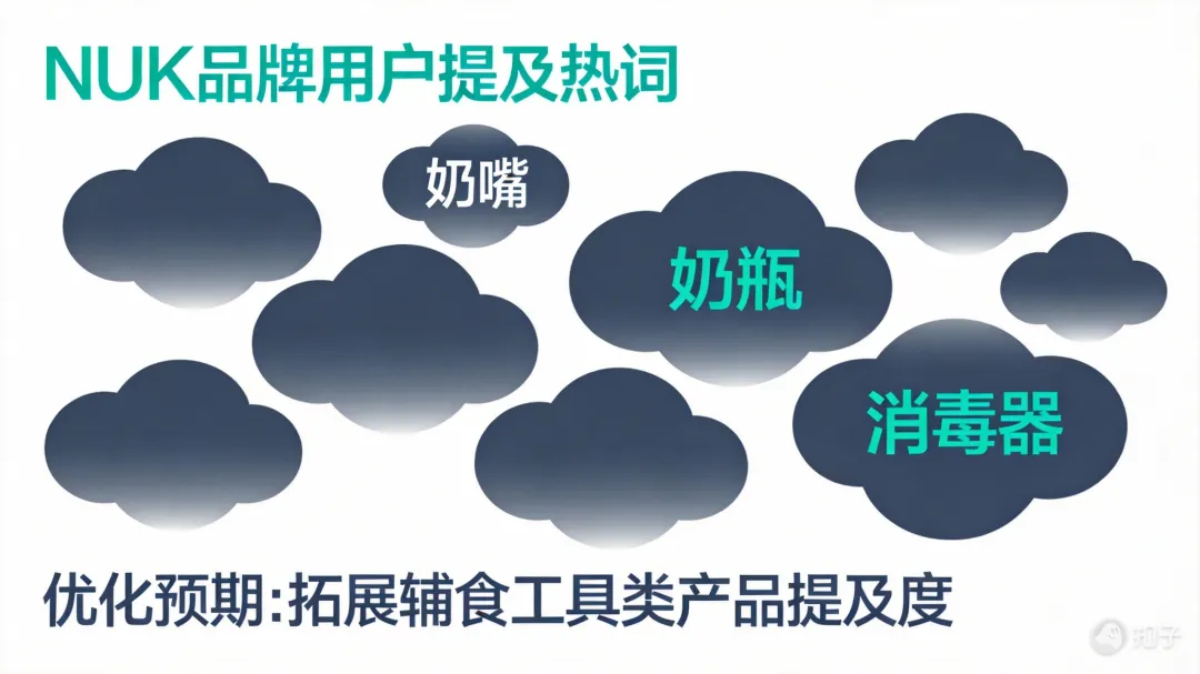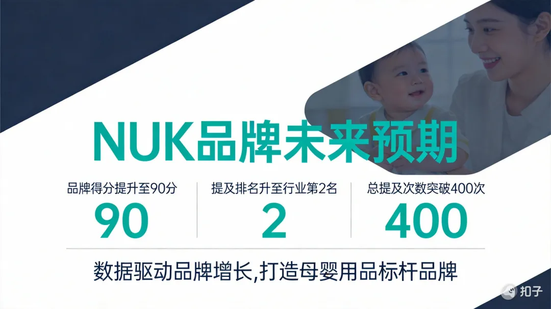 优势场景:高端推荐场景提及率最高,达到68%,领先行业均值13个百分点,说明NUK品牌在高端推荐场景的表现较好 短板场景:对比决策场景提及率最低,仅22%,低于行业均值8个百分点,说明NUK品牌在对比决策场景的表现不佳 潜力场景:日常种草场景提及率较低,但用户转化意愿强,NUK品牌可以通过UGC内容补充来提升在该场景的表现