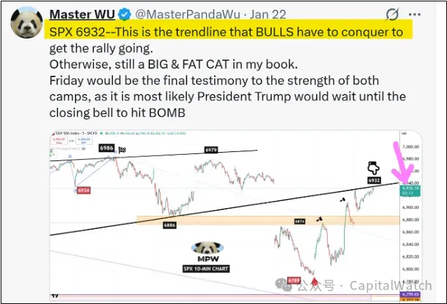 周四中午,当反弹延伸至 6932 附近的极端水平时, 买入了一些 1/23 的 SPY 看跌期权并发布了这条推文 —— 事实证明, 这一警告几乎在精确的时刻锁定了那个小顶部 。 随后标普 500 指数下跌了 30 点。