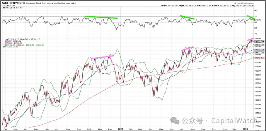 纽交所腾落指数(NYSE ADLINE):它与几天前的新高形成了微弱背离, 这总是会导致某种形式的修正。 事实上,当前的 ADLINE 在上一个股指顶部创下了历史新高, 在我看来,这确认了 SPX=6986 并非本轮牛市的顶部 。