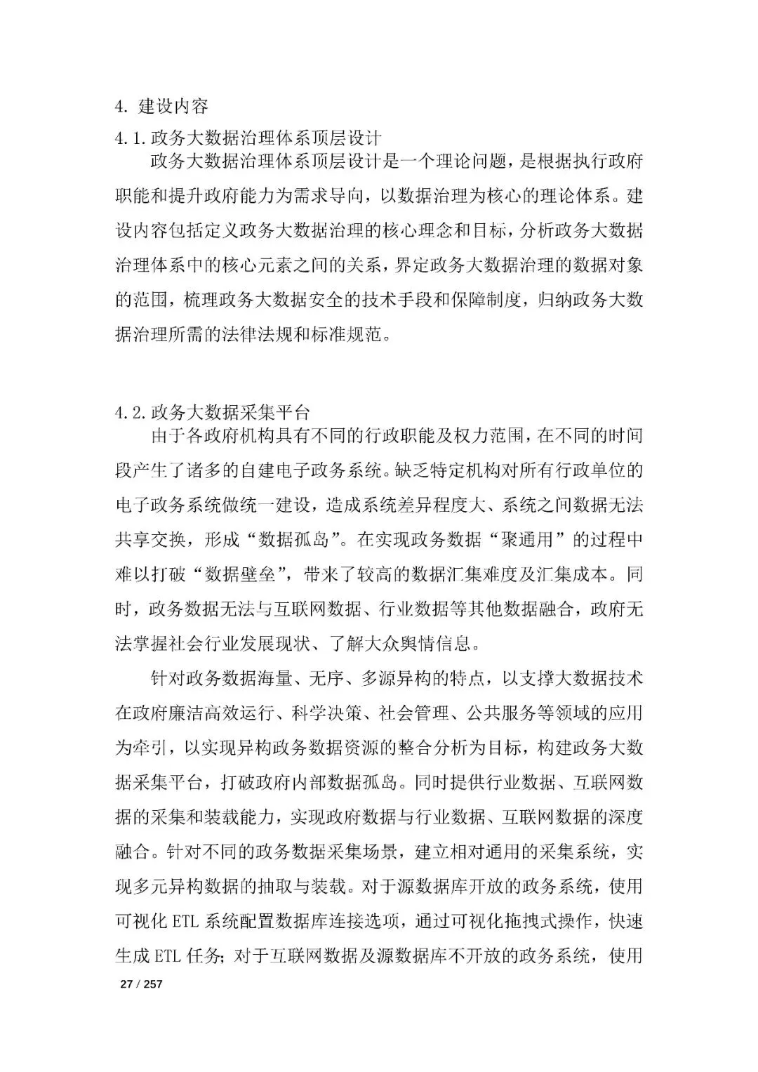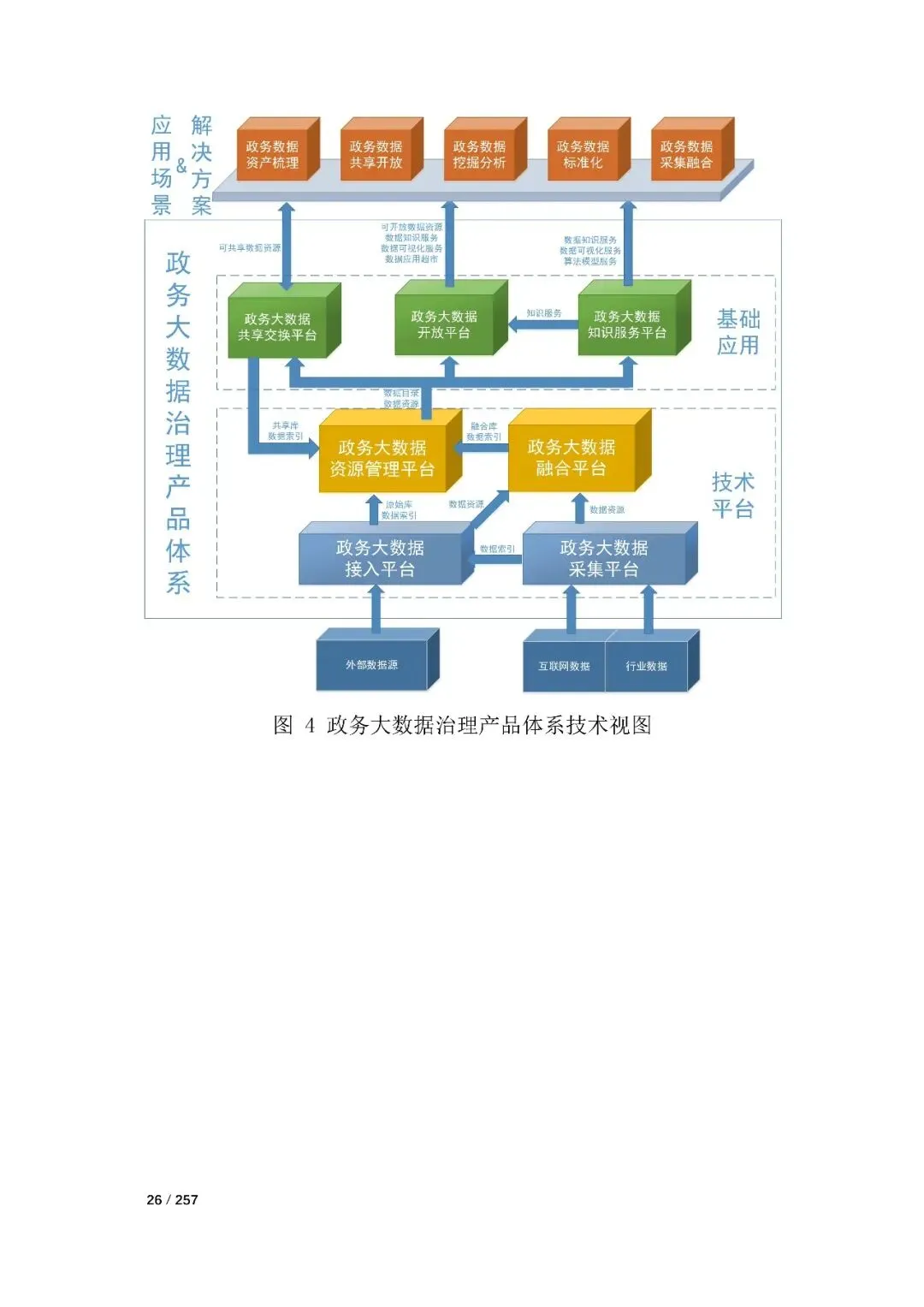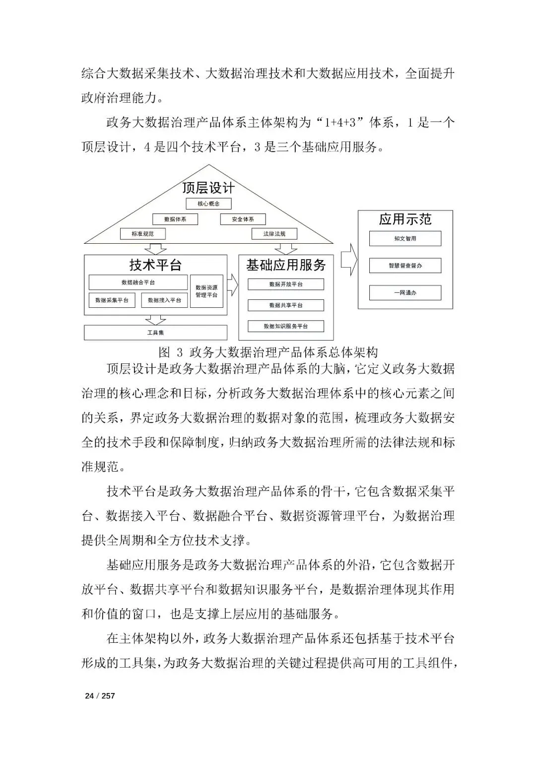 目标:构建“1+4+3”政务大数据治理产品体系,即1个顶层设计、4个技术平台(采集、接入、融合、资源管理)、3个基础应用服务(共享交换、开放、知识服务)。