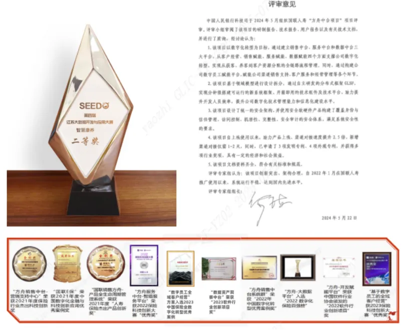 支部科技先锋队凭借“基于机器学习的医疗控费预警模型”荣获第四届江苏省大数据开发与应用大赛智慧康养赛道二等奖,方舟智能中台相关子项目还荣获“2023中国数字化转型优秀案例奖”“2023软件行业创新项目奖”2023保险科技创新大赛“优秀奖银奖”等省市及行业权威大奖十余项。国联数智中台项目还被中国人民银行评定为国内先进技术水平。充分表明支部在推动产学研用深度融合、促进科技创新成果转化方面取得了显著成效,为公司在科技赋能保险领域的持续发展奠定了坚实基础。