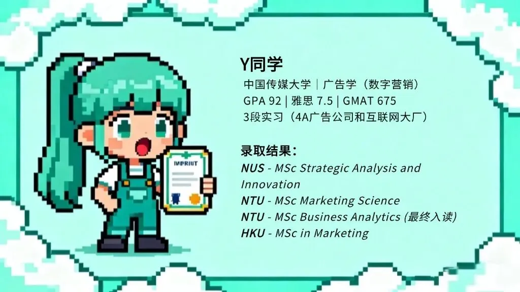 从中国传媒大学的广告才女,到手握新国立、南洋理工顶尖商学院 Offer 的准分析师,Y 同学的“小马过河”式申请路,每一步都走得踏实而坚定。
