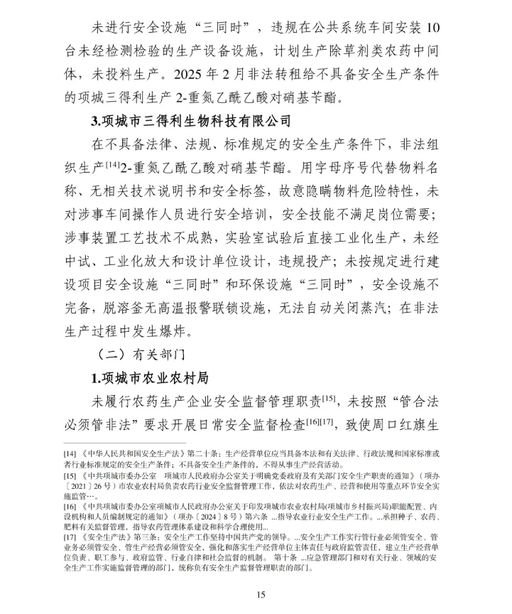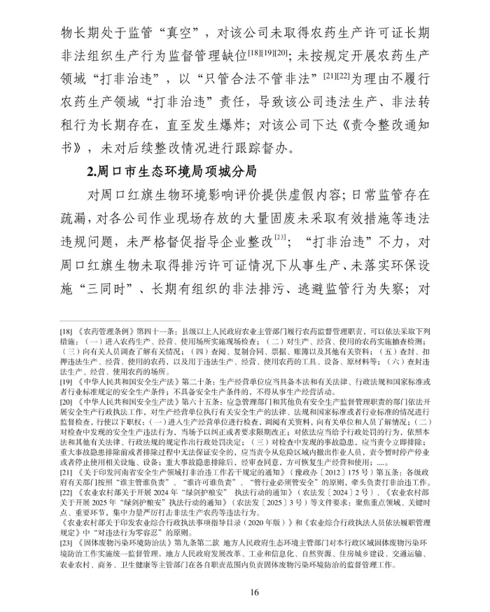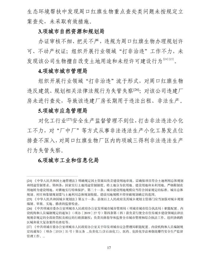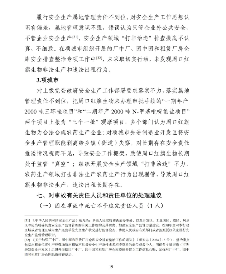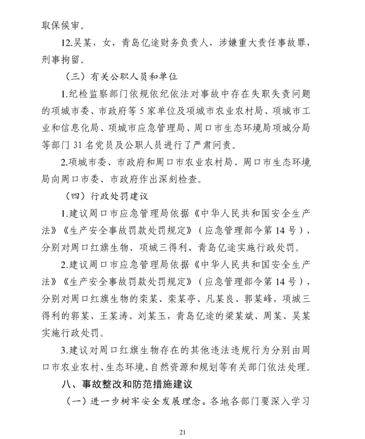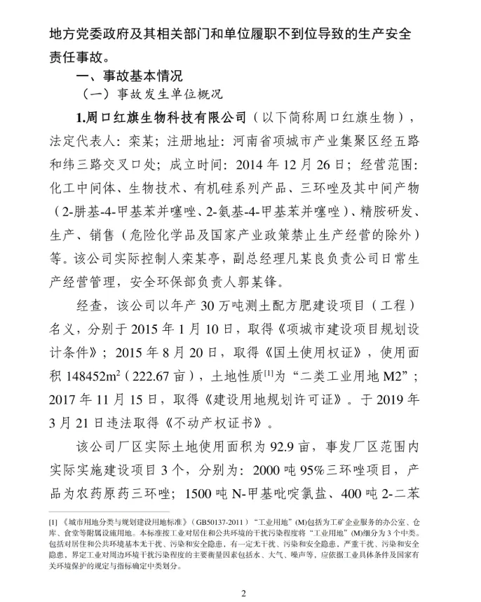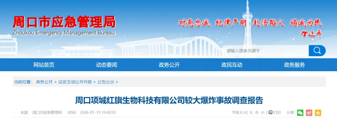 1月19日,周口市应急管理局公布了《周口项城红旗生物科技有限公司较大爆炸事故调查报告》。认定该起事故是一起因企业违法出租、非法生产,地方党委政府及其相关部门和单位履职不到位导致的生产安全责任事故。
