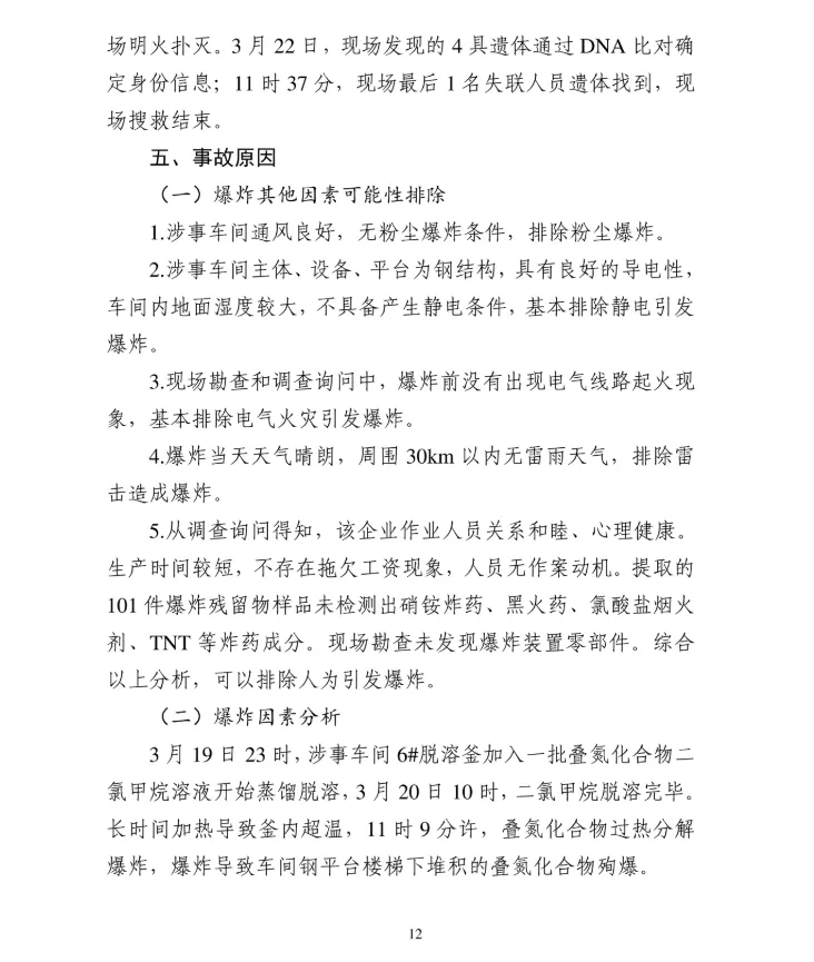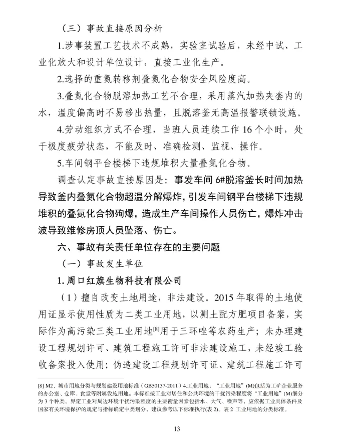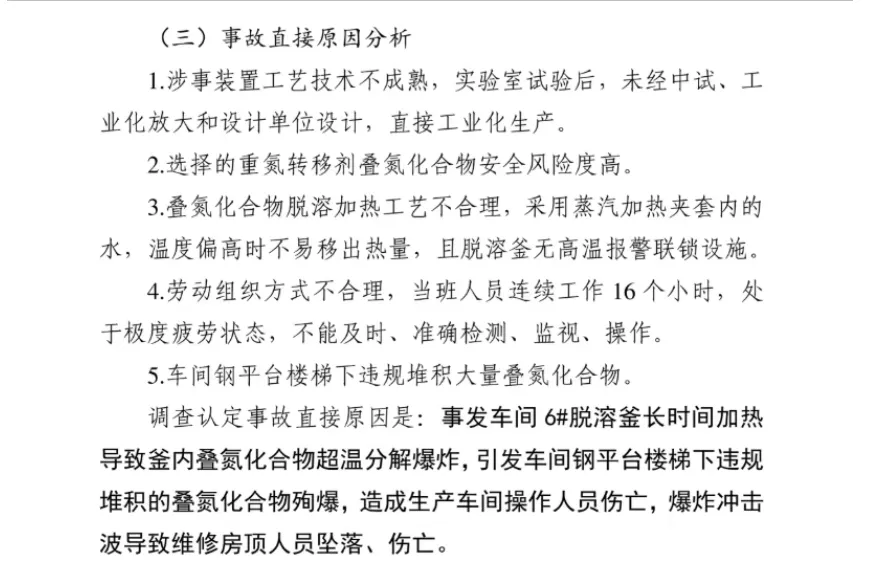 调查认定事故直接原因是:事发车间6#脱溶釜长时间加热导致釜内叠氮化合物超温分解爆炸,引发车间钢平台楼梯下违规堆积的800-900kg叠氮化合物殉爆,造成生产车间操作人员伤亡,爆炸冲击波导致维修房顶人员坠落、伤亡。