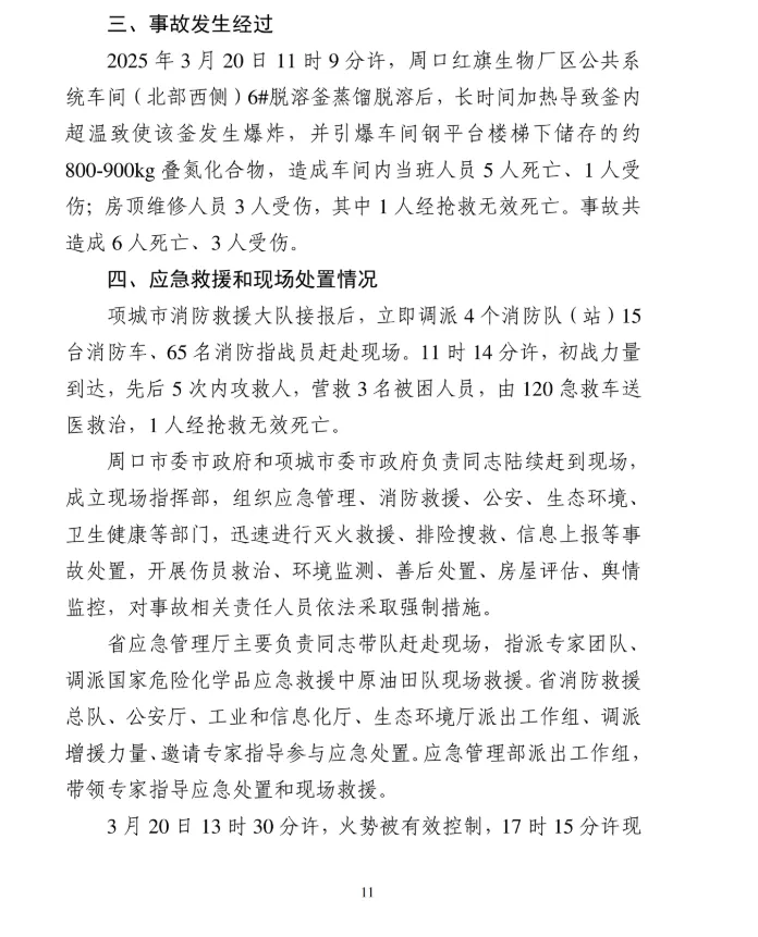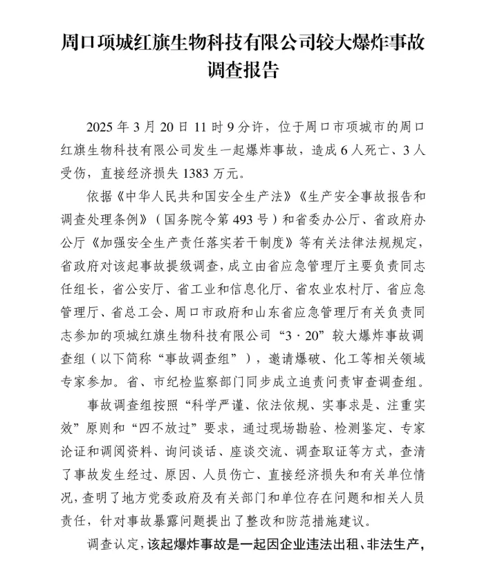 2025年3月20日,河南周口项城市周口红旗生物科技有限公司发生一起爆炸事故,造成6人死亡、3人受伤,直接经济损失1383万元。