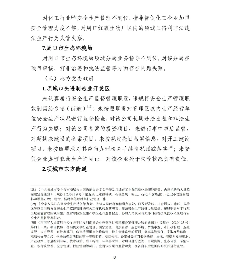 纪检监察部门依规依纪依法对事故中存在失职失责问题的项城市委、市政府等5家单位及项城市农业农村局、项城市工业和信息化局、项城市应急管理局、周口市生态环境局项城分局等部门31名党员及公职人员进行了严肃问责。