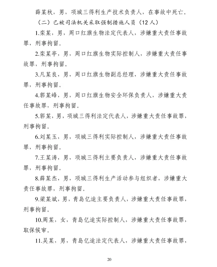 周口红旗生物法定代表人栾某、周口红旗生物实际控制人栾某婷等12人涉嫌重大责任事故罪,已被司法机关采取强制措施。