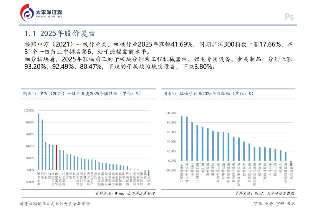 机械行业2025年复盘。机械行业2025年涨幅41.69%,同期沪深300指数上涨17.66%,在31个一级行业中排名第6,处于涨幅靠前水平。细分板块看,2025年涨幅前三的子板块分别为工程机械器件、锂电专用设备、金属制品,分别上涨93.20%、92.49%、80.47%,下跌的子板块为轨交设备,下跌3.80%。报表端,