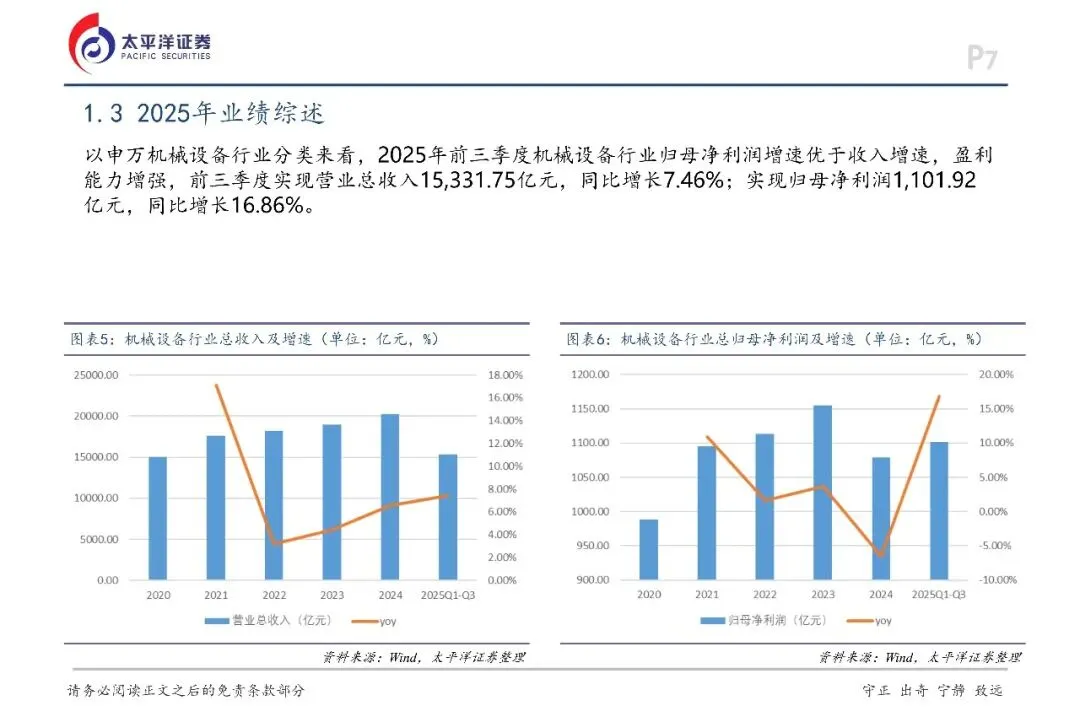 2025年前三季度机械设备行业归母净利润增速优于收入增速,盈利能力增强,前三季度实现营业总收入15,331.75亿元,同比增长7.46%;实现归母净利润1,101.92亿元,同比增长16.86%。