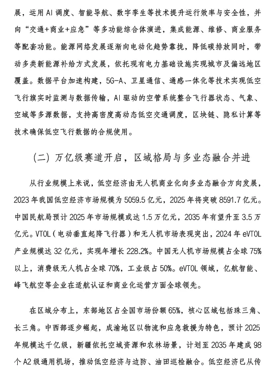 基础设施:2025 年为 “低空基建年”,形成 “起降场 + 能源网络 + 数据平台” 三位一体架构;起降场向 “交通 + 商业 + 应急” 综合体演进,能源网络趋向电动化,数据平台整合多源数据支持调度。