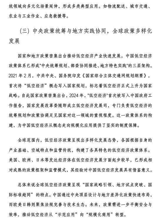 中国政策:形成 “中央统筹规划 + 部委协同推进 + 地方特色实践” 三层架构;2021 年《国家综合立体交通网规划纲要》首提 “低空经济”(升为国家战略),2024 年 “低空经济” 入政府工作报告,国家发改委设低空经济发展司。