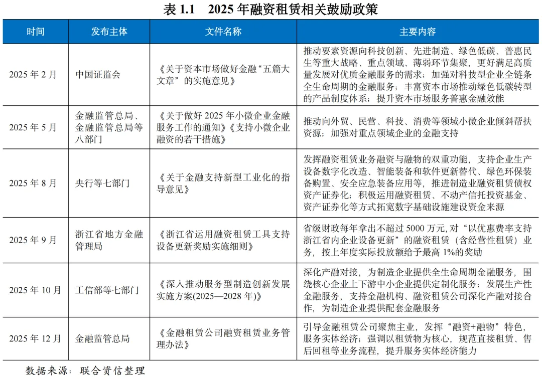2025年,多部门协同发力,围绕实体经济重点领域,出台多项鼓励政策;支持中小微企业融资,推动租赁行业回归“融资+融物”本源,赋能实体经济;资产证券化业务进一步规范。