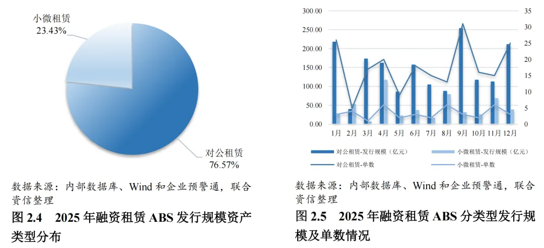 资产细分类型上,受国家普惠金融政策支持、设备更新需求释放,2025年,小微租赁类ABS占比有所提升。2025年,对公租赁类ABS和小微租赁类ABS分别发行210单和41单,发行规模分别为1728.28亿元和528.92亿元,其中小微租赁类ABS发行规模占比较上年增长了4.74个百分点,增至23.43%。