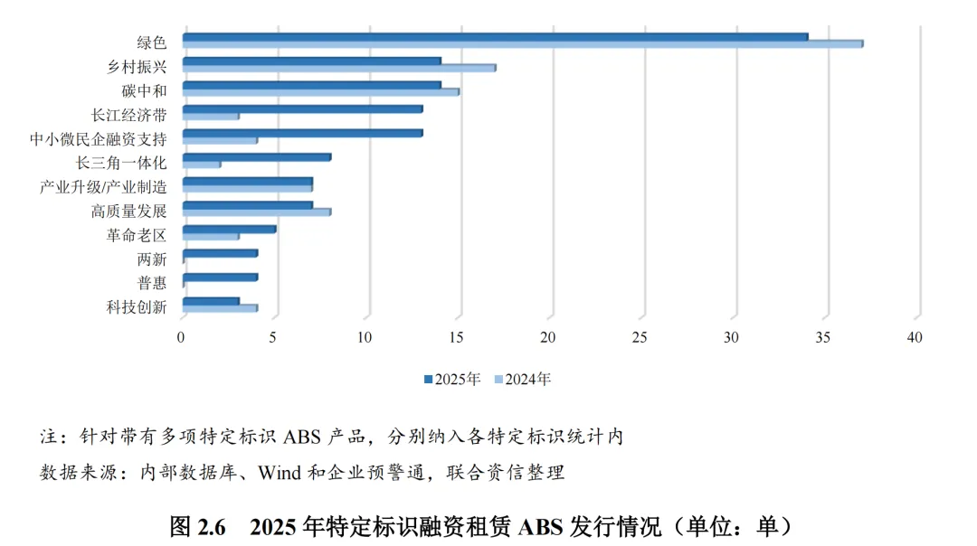 特定标识方面,2025年,融资租赁ABS呈现绿色引领、区域振兴与产业融合协同的多元化格局。在多项引导租赁公司服务重点领域政策支持下,绿色、乡村振兴、碳中和、中小微企业融资支持、产业升级和区域协调发展(长江经济带和长三角一体化)等特定领域标识的融资租赁ABS保持活跃,同时不断涌现低空经济、两新、数据资产等新兴特定标识,特定标识体系更加丰富。特定标识从单一向多项组合发展,多项特定标识ABS产品成为市场新热点。2025年融资租赁ABS中,绿色ABS、碳中和ABS、乡村振兴ABS分别发行34单、14单和14单,发行规模分别为232.45亿元、111.17亿元和105.35亿元。