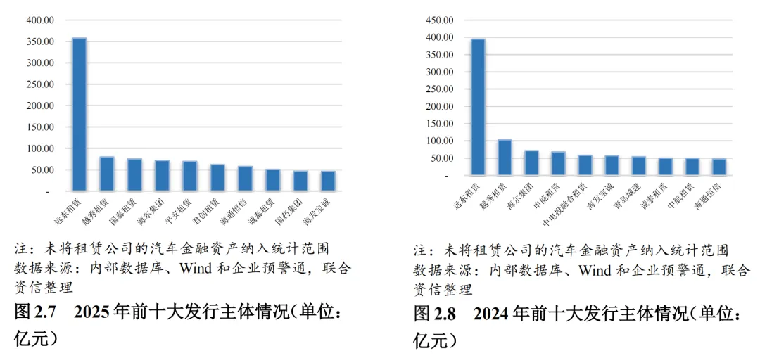 2025年,融资租赁ABS市场的发行主体更加多元化,产业系与绿色系租赁主体扩容,地方国资加速布局,头部效应依旧显著。2025年融资租赁ABS市场的发行主体共118家,其中有37家是相对于2024年新增的发行主体,新增发行主体多为地方平台下属租赁公司和地方产业背景租赁公司,服务地方产业升级与公共服务,新增发行主体为融资租赁ABS市场带来了增量活力。2025年,前十大发行主体分布较上年同期有所调整,合计发行规模占比40.67%,较同期稍降4.53个百分点,头部效应依旧显著。