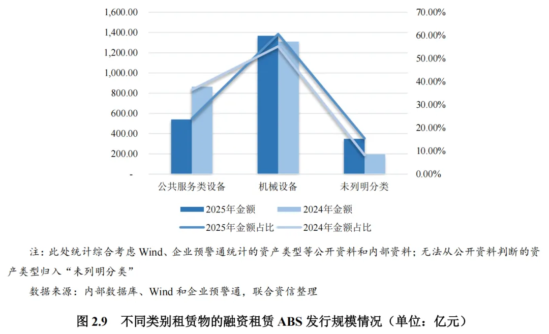 2025年,融资租赁ABS入池资产涉及的租赁物以机械设备2为主,公共服务类设备受平台化债影响占比有所调整。与2024年同期相比,2025年租赁物为公共服务类资产的发行规模占比降至23.97%,租赁物为机械设备类的发行规模占比增至60.59%。绿色与智能双轮驱动租赁物升级,绿色能源设备(如光伏、风电、储能等)和智能设备投放规模持续增长。此外,新兴产业租赁物不断涌现,“两新”领域租赁物适配产业政策导向,数据相关设备、低空飞行等创新租赁物也在ABS市场崭露头角。