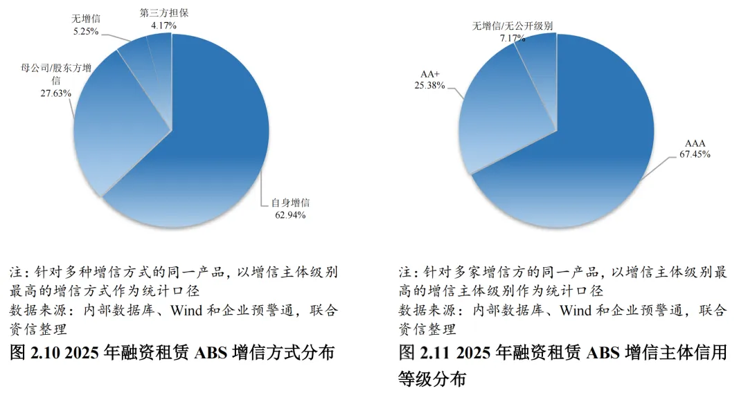 从增信方式看,大部分融资租赁ABS产品附有原始权益人自身/母公司/股东方提供的信用支持。2025年,引入外部增信方式的融资租赁ABS发行规模占比为94.75%。其中,母公司/股东方增信占比27.63%,原始权益人自身增信占比62.94%,第三方专业机构担保占比4.17%。从增信主体信用等级来看,综合企业融资需求的成本考量,增信方信用级别以高信用等级为主,增信方信用等级为AAA和AA+占比分别为67.45%和25.38%。