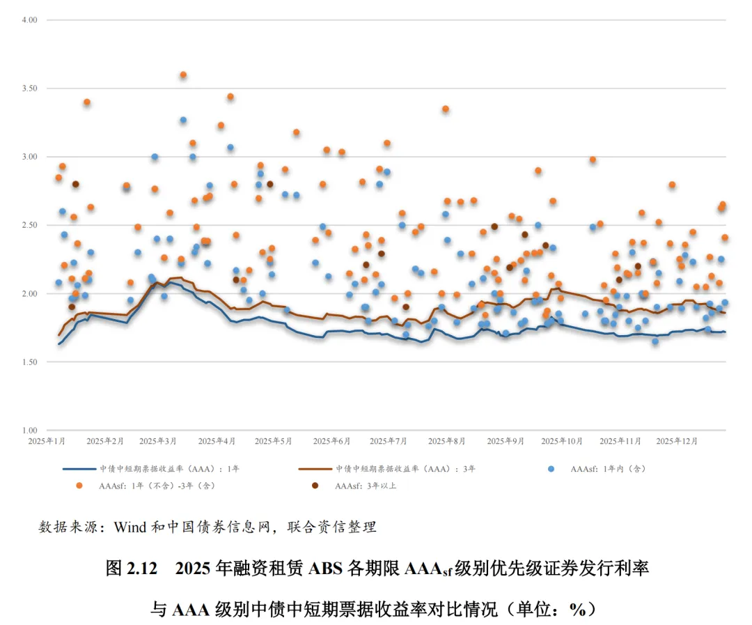 2025年,我国整体经济形势较为稳健,货币政策仍保持宽松基调,但力度和节奏受稳汇率、财政扩张等因素制约,债券市场利率呈区间震荡走势。从级别分布看,2025年,融资租赁ABS的AAAsf、AA+sf级别优先级证券平均发行利率分别为2.29%、3.18%,分别较上年同期下降40bps、20bps。