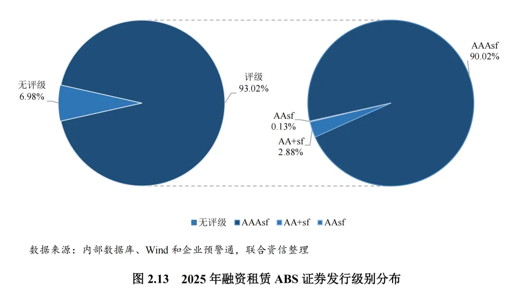 从优先级证券首次评级级别来看,融资租赁ABS仍以高信用等级为主。2025年,AAAsf和AA+sf级的优先级证券规模分别占比90.02%、2.88%。其中,AAAsf级证券占比与上年同期基本保持稳定,主要依赖于增信主体较强的信用水平、良好的资产质量、有力的增信措施等因素。