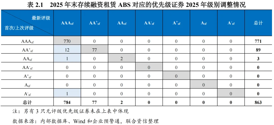 截至2025年末,融资租赁ABS存续优先级证券共866只(含无评级),其中有14只优先级证券级别于2025年调高,无下调情况,反映出市场的稳健性。级别调高的原因主要包括:剩余资产整体资信水平有所提升;超额利差累积形成了较高的超额抵押,使剩余优先级证券获得的信用支持提升;资产池剩余期限缩短,使得资产池现金流不确定性降低等。