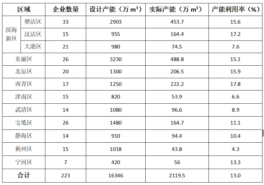 通过上表分析,目前天津市预拌混凝土行业产能过剩问题依然严峻,截止2025年12月底,天津市混凝土行业年设计生产能力 16346万立方米,同比减少2.5%。全市2025年度预拌混凝土企业共生产供应各等级混凝土 2119.5万m³,比去年同期下降4.8%,下降幅度低于全国平均水平,天津混凝土市场受产业结构调整保持充分的韧性;天津市混凝土行业平均产能利用率13%,仍低于全国平均水平。其中产能利用率最高的区域为西青区为17.8%,仍低于去年同期水平21%。产能利用率最低的为蓟州区仅为4.3%,相比去年同期水平仍在下滑。大港区、津南区、武清区产能利用率均不足10%。东丽区搅拌站产能总量继续领跑其他区域,蓟州区产能总量最低。天津市环城四区域普遍高于其他区域,四区合计产能占比天津市总产能47.3%;滨海新区生产企业总数量有所降低,其中塘沽区和汉沽区本年度混凝土方量高于去年同期。