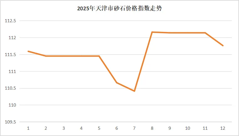 砂石数据中心显示,2025年1-11月全国砂石需求总量达116.16亿吨,较2024年同期的125.30亿吨减少9.14亿吨,同比下降7.29%,为连续第四年下降。机制砂占比持续提升,天然砂因环保与资源约束供给受限;绿色矿山与智能矿山加速推进,但行业整体同质化竞争严重。天津市市场砂石价格指数从走势能看出,上半年整体呈小幅波动下滑,7 月出现跳涨,指数快速攀升;7-11 月处于企稳状态,年末略有回落,但仍高于上半年的多数时段。这反映 2025 年天津砂石价格上半年温和走弱,下半年受供需、政策等因素影响上升后保持较高位置,全年整体价格重心上移。