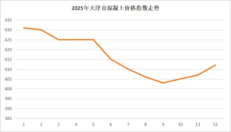 百年建筑网相关数据显示,2025年预估全国混凝土产量为22.5亿方,同比下降10%。截至2025年11月底,C30混凝土非泵均价同比下跌7.7%;国内在备案混凝土企业数量为21049家,同比减少6.8%,2025年国内混凝土企业迎来企业减少元年;混凝土企业应收账款回款率为42.6%,混凝土行业回款情况呈现 “波动中持续承压” 的特征。通过上表分析,天津市混凝土市场价格2025年走势能看出全年整体呈波动下行后小幅回升的趋势,1 月指数是全年高点;1-8 月持续下滑,8 月跌至全年低位;9-12 月逐步小幅回升,但年末指数仍低于年初水平。这反映 2025 年天津混凝土价格全年重心下移,仅在年末略有回暖,整体价格压力较明显。