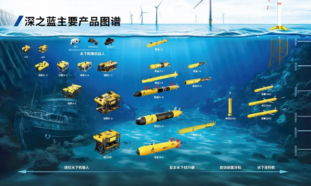 深之蓝的主要产品包括缆控水下机器人(ROV)、自主水下航行器(AUV)、水下滑翔机(AUG)、自动剖面浮标和水下助推机器人等,广泛应用于海洋安全、海洋工程、应急救援、水利水电、海洋科考和海洋文旅等领域。公司通过长期的技术积累和创新,已掌握四大类15项核心技术,构建了完整的水下机器人产品谱系,并在国内外市场建立了良好的品牌声誉。
