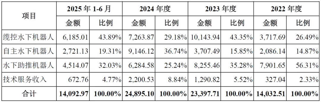 自主水下机器人收入增长迅速,2024年实现收入9,146.12万元,较2023年增长146.70%,成为公司重要的增长引擎;缆控水下机器人收入波动增长,2025年1-6月占比达43.89%,重回第一大收入来源;技术服务收入稳步增长,占比从2022年的2.33%提升至2025年1-6月的4.77%,业务多元化成效显著。