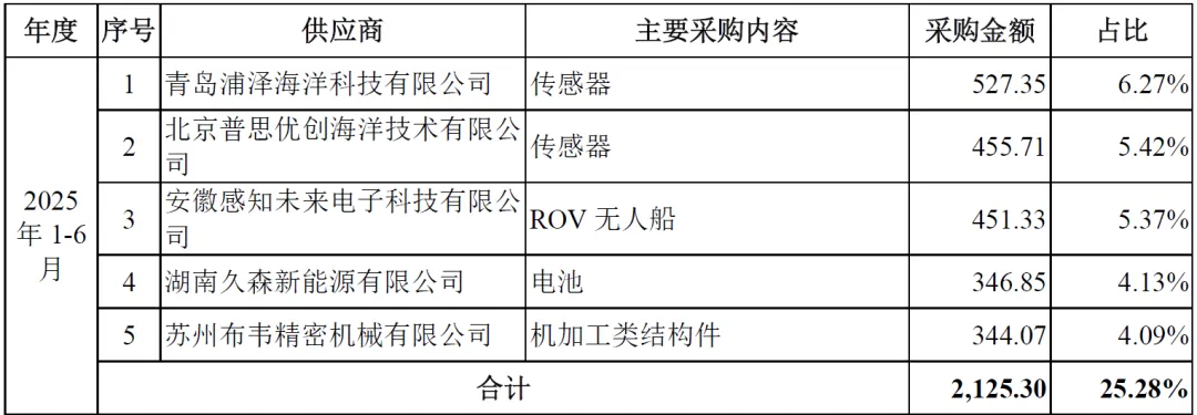 深之蓝的主要原材料包括电气标准件、传感器、结构件、机电类等。报告期内前五名供应商采购占比分别为31.15%(2022年)、19.52%(2023年)、20.90%(2024年)和25.28%(2025年1-6月),采购集中度相对较低。