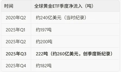 •2025年,是黄金ETF有史以来最火的一年。全球投资者通过ETF净买入了 801吨 黄金,总共砸了 890亿美元,双双创下历史纪录!