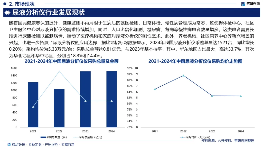 尿液分析仪是测定尿中某些化学成分的自动化仪器,尿液分析仪在计算机的控制下通过收集、分析试带上各种试剂块的颜色信息,并经过一系列信号转化,最后输出测定的尿液中化学成分含量,是医学实验室尿液自动化检查的重要工具。随着国民健康意识的提升,健康监测不再局限于生病后的就医检测,日常体检、慢性病管理成为常态,这使得体检中心、社区卫生服务中心对尿液分析仪的需求持续增加,同时,人口老龄化加剧,糖尿病、肾病等慢性病患者数量增多,这类患者需要长期进行尿液检测以监测病情,推动了医疗机构和家庭对尿液分析仪的刚性需求,此外,养老机构、社区康养中心等新兴场景的兴起,也进一步拓展了尿液分析仪的应用边界,据比地招标网数据显示,2024年我国尿液分析仪采购总量达1521台,同比增长0.20%;采购均价为5.33万元/台;采购总金额达0.81亿元,与2023年基本持平,其中,华东地区占比最大,高达33.7%,其次为华北地区和华中地区,分别占18.3%和14.4%。