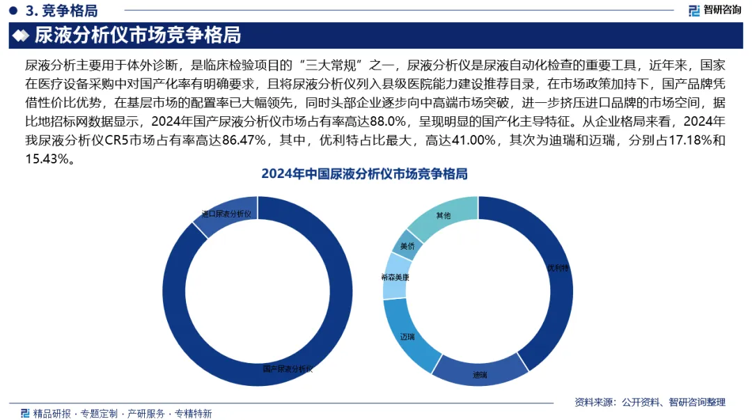 市场竞争格局:据比地招标网数据显示,2024年国产尿液分析仪市场占有率高达88.0%,呈现明显的国产化主导特征。从企业格局来看,2024年我尿液分析仪CR5市场占有率高达86.47%,其中,优利特占比最大,高达41.00%,其次为迪瑞和迈瑞,分别占17.18%和15.43%。